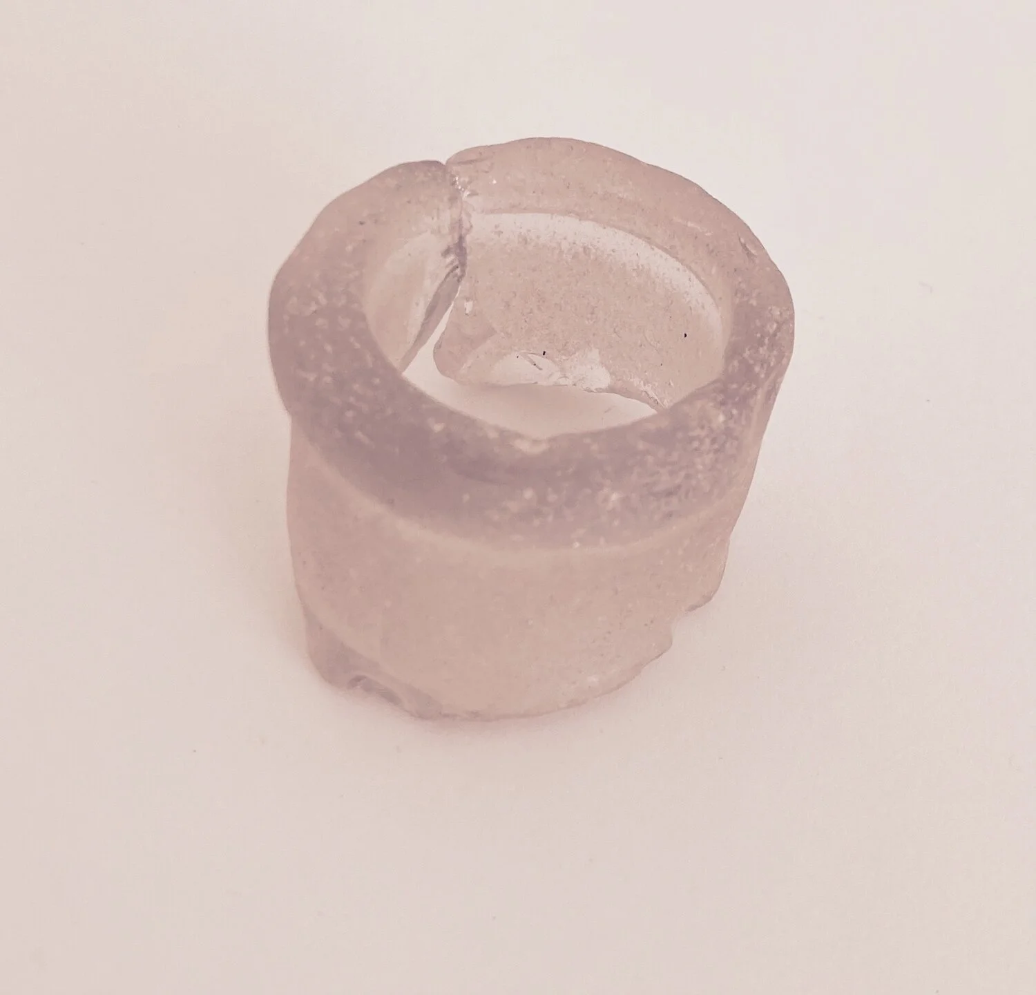 The majority of my collection consists of Kelly green, brown, white and clear pieces, which are the most common finds and usually originate from beverage bottles and windowpanes. Harder to come by colors include citron (olive oil bottles), lime green (soda bottles), jade (mineral water and wine bottles), amber, (whiskey and beer bottles), and pink (tableware). My most prized pieces include a purple bottle top, (pictured below) a thick triangular piece of gray, and the elusive red nugget, (finding ratio 1:5,000), which may have come from discarded warning lights, tableware or stained glass.