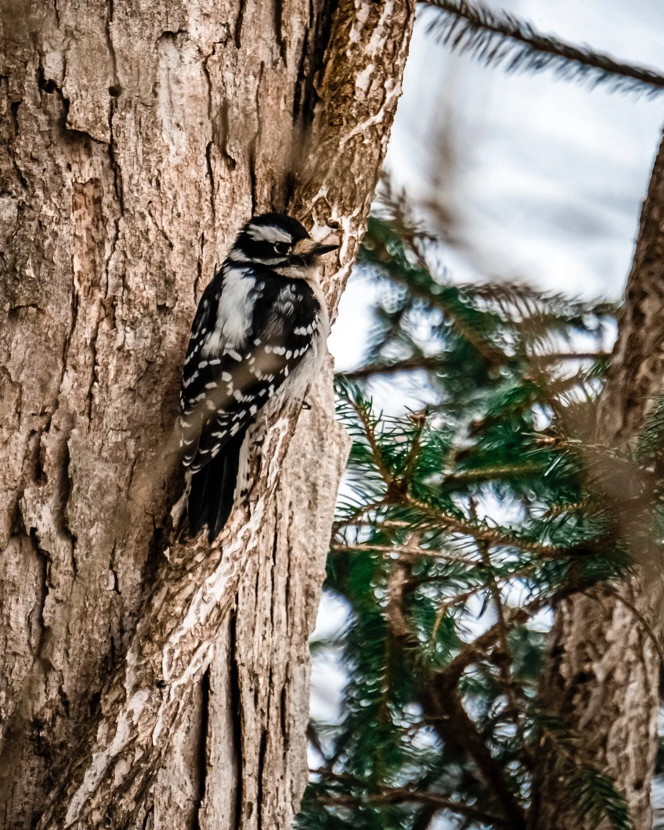 The downy woodpeckers are the troublemakers, the smart alecks, always looking for someone to mix it up with. Their favorite sparring partners are fellow downy woodpeckers, and always seem to seek each other out, arguing over who has the best perch or whose turn it is on the suet feeder. These feisty creatures are always up to something.